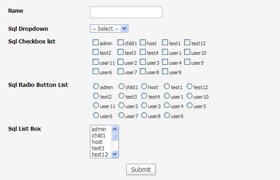 For example, you have five fields Name, Sql Dropdown, Sql Checkbox list, Sql Radiobutton list, Sql Listbox in your form.
