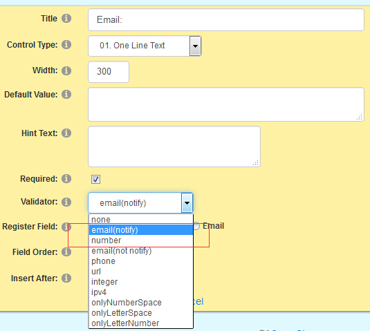 5. When you add Email field, you need to choose Email(Notify) for Validator option. In this way, it could confirm form submitter can get emails and could validate Email format filled by users.